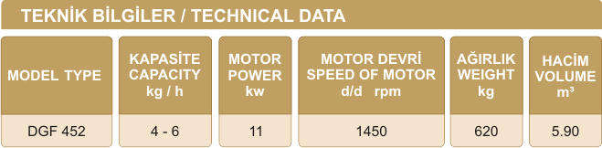 Bu makine maksimum ürün verimi ve minimum yağ içeriyle atıştırmalık gıdalar için tahıl ve biracılıkta kullanılacak tahılların üretiminde idealdir. Üretim tahılın kabuklarının dökülmesine ve tüm tohumun uzaklaşmasına olanak tanıyan sürtünme ve darbe etkilerine tabidir. Özel sertleştirilmiş çelikte sürtünmeye tabi olan bileşenlerle kaynaklı çelik levhadaki dayanıklı yapı. İşleme odacığı özellikli delikli çelik levhadan bölme statoru ve bir motordan meydana gelmektedir. Ağır hizmet aşınmaz çelikten mamül özel kesme profiline sahip sekiz kollu bıçaklar motora bağlanırlar. Makine ses yalıtımlı iç kaplamalı şekilde teslim edilmektedir. Makine hızını ve ürün granülometrisini değiştirmek için elektronik invertörler kontrol edilen elektrikli motor.