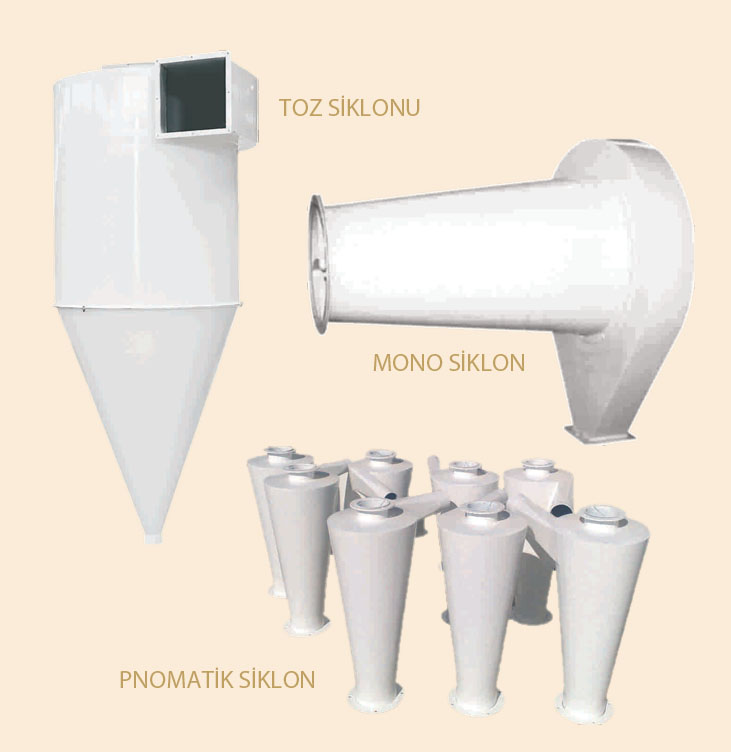 Toz siklonları, temizleme devresinde aspiratörlerin çıkışına bağlanır. Hava'nın içindeki tozların ayrılmasında kullanılır. Toz siklonları tamamen çelik saçtan imal edilmiştir. Alt ve üst bağlantıları için flanş konulmuştur. Toz siklonlarının altına hava kilidi konulmalıdır.