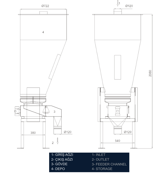 Metal konstrüksiyondan imal edilmiştir. Filitre çıkışlarında ve atık ürün depo altlarında kullanılır. Alt gövde sacdan yapılmıştır ve vibrasyonu absorbe edecek lastik takozlarla desteklenmiştir. Giriş ve çıkışları torba takılacak şekilde dizayn edilmiştir. Makina vibrasyonu vibro motor ile sağlanmıştır.